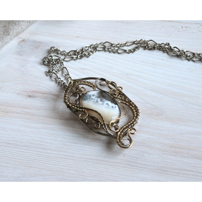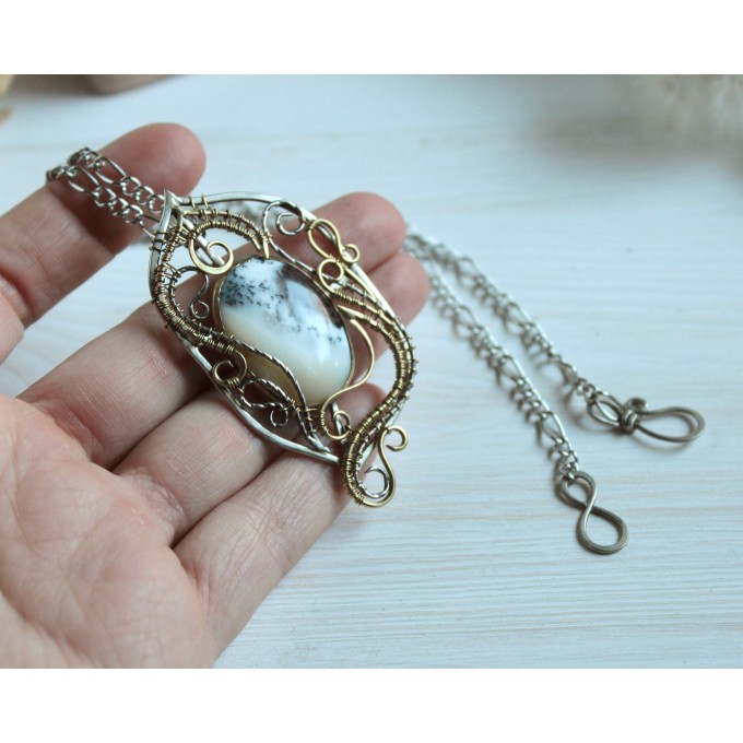Wire wrapped, Mixed metal necklace-brooch with dendritic agate